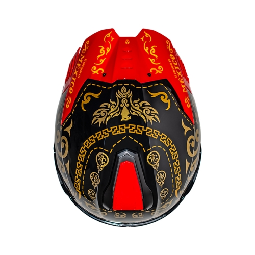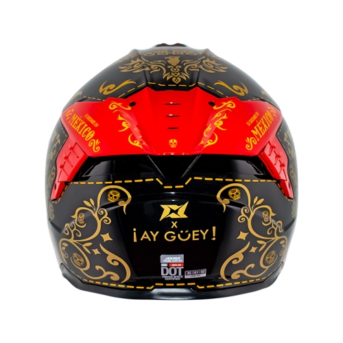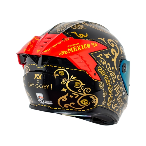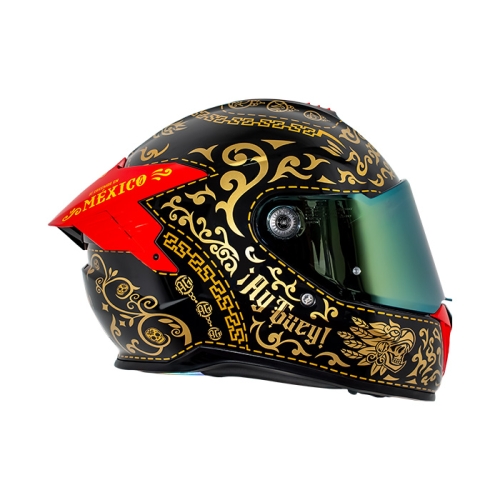 Un modelo que presenta una base negra, audaz y moderna, contrasta con los destellos dorados que recuerdan a los botones y bordados de un traje de mariachi. Un diseño único que te hará destacar en la carretera y celebrar tus raíces mexicanas.