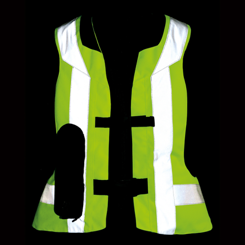 - Sistema de despliegue a presión, se ajusta en la cintura mediante una tira de velcro en el interior del chaleco.