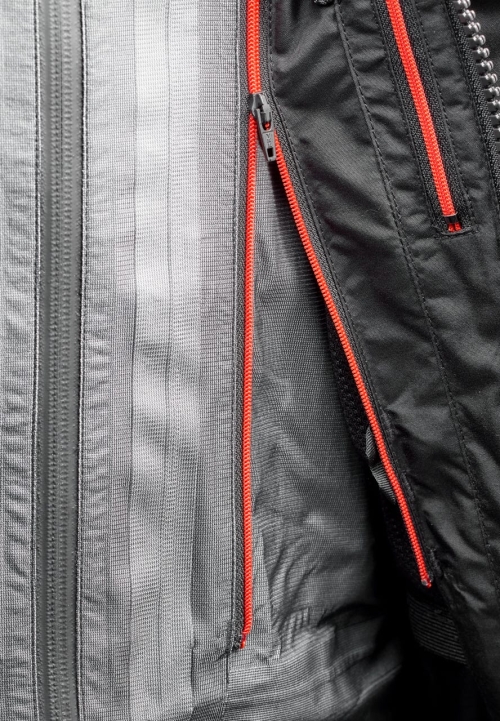 En la parte delantera, hay 2 paneles de ventilación que se pueden mantener abiertos gracias a una pestaña conectada con un botón a presión en el exterior de la chaqueta. Con los 3 paneles de ventilación del frontal abiertos, en combinación con las 2 cremalleras posteriores de escape, se crea una increíble corriente de aire por toda la chaqueta. Y además encima se puede combinar con las múltiples cremalleras de ventilación de los brazos. Así esta prenda te refresca y te confiere comodidad a altas temperaturas. Los dos bolsillos frontales, el gran bolsillo en la riñonera, y los dos bolsillos interiores proporcionan una amplia capacidad de carga; puedes llevar contigo tus objetos personales sobradamente durante tu desplazamiento. El bolsillo de la espalda es incluso capaz de guardar los forros interiores cuando no los usas. Todos los bolsillos exteriores se cierran con cremalleras, para no perder nada de lo que te importa.